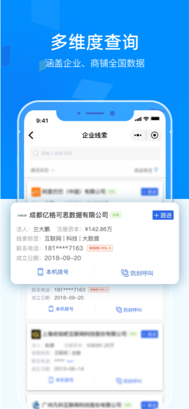 主流平台8亿人群画像,1.8+亿企业数据、5亿+联系方式、3000万+精准老板,2万家私募基金,120万+创业项目,5000万+加盟商,整体打通工商、招聘、资质等多平台数据,快速找到优质客户。