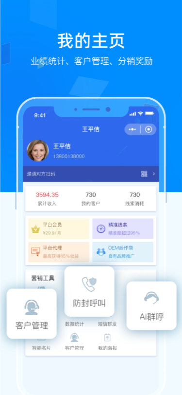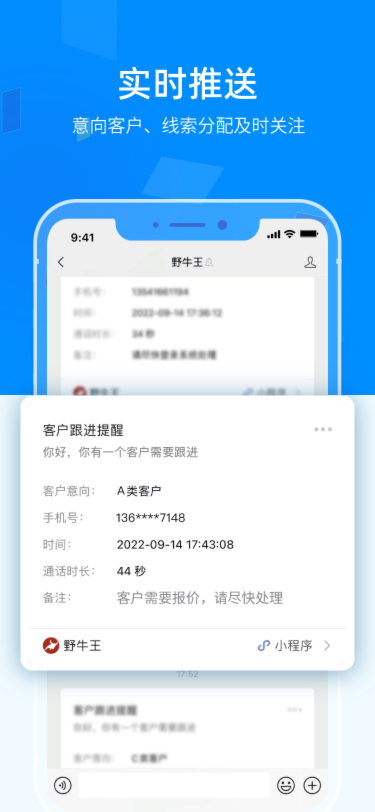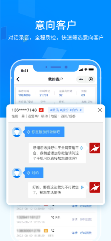 野牛王SCRM(超级开放功能)支持用户任意客户数据集导入、管理、智能分配(多规则、多权重)、回收、实时推送至微信通知、微信一键管理操作,支持三方接入智能电话/AI电话功能,统计分析功能。
